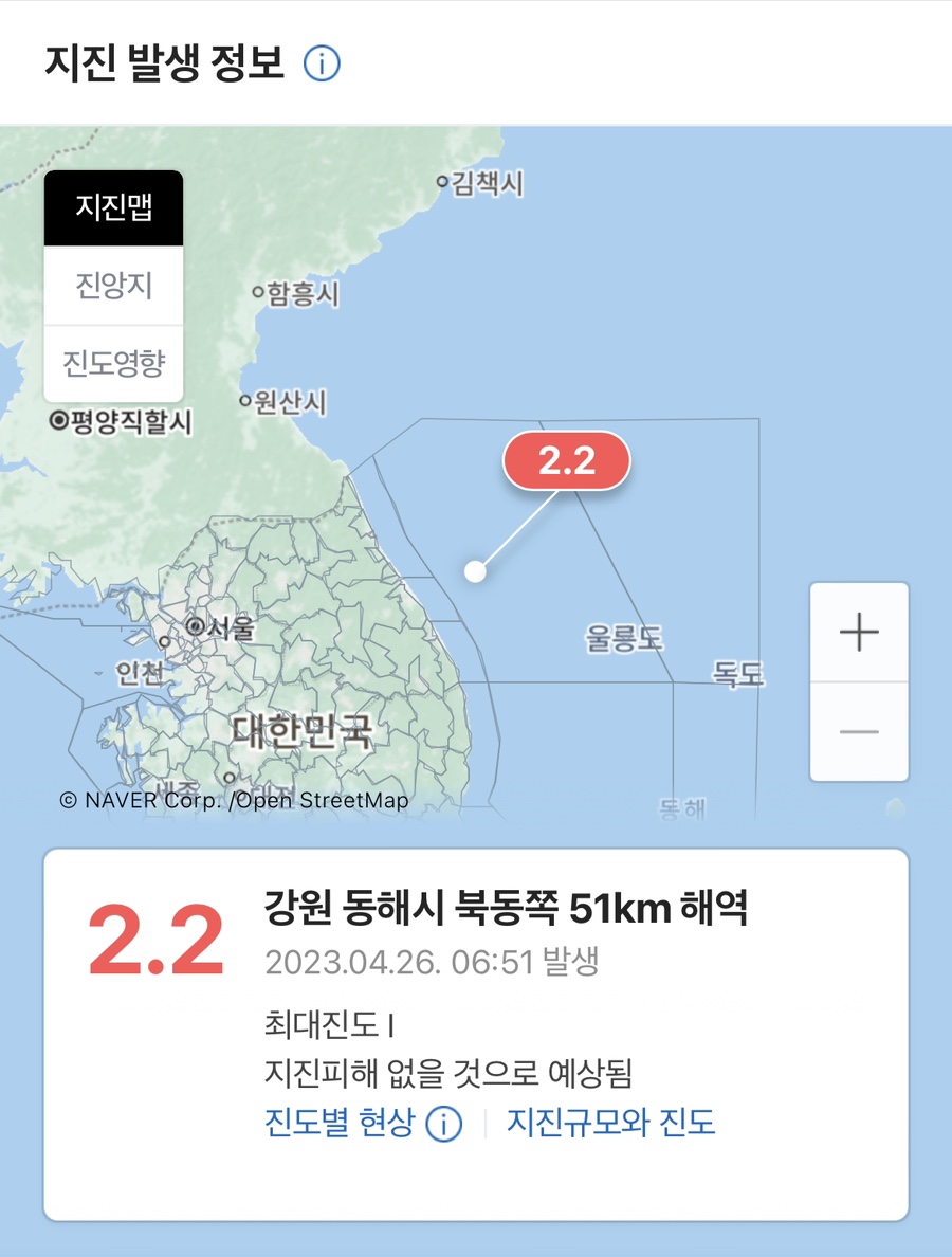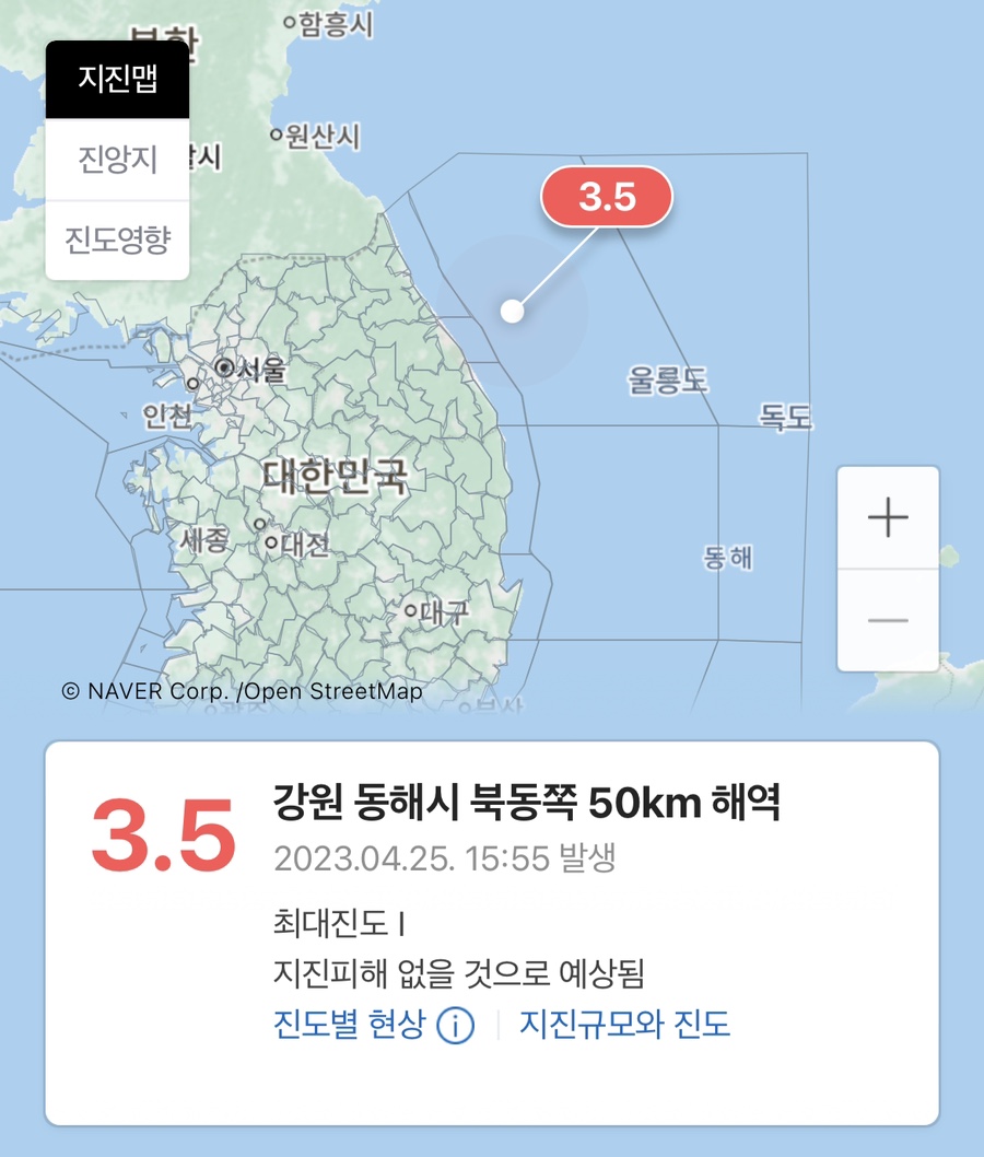 강원도 동해시에 계속적으로 지진이 발생하고 있습니다. 사흘간 동해 앞바다에서 연속 17회 지진이 발생했고 문경서도 약한 지진이 발생했습니다. 이에 행정안전부는 지진 위기경보 '관심'이 발령하였습니다. 지난 사흘간 동해안에서 규모 3.0 이상의 지진이 2회, 2에서 2.9이하의 지진이 5회, 2.0미만이 10회로 집계 되었습니다. 그리고 문경에서는 4월 25일 오후 1시 22분 경 규모 2.7의 약한지진이 발생하였습니다.