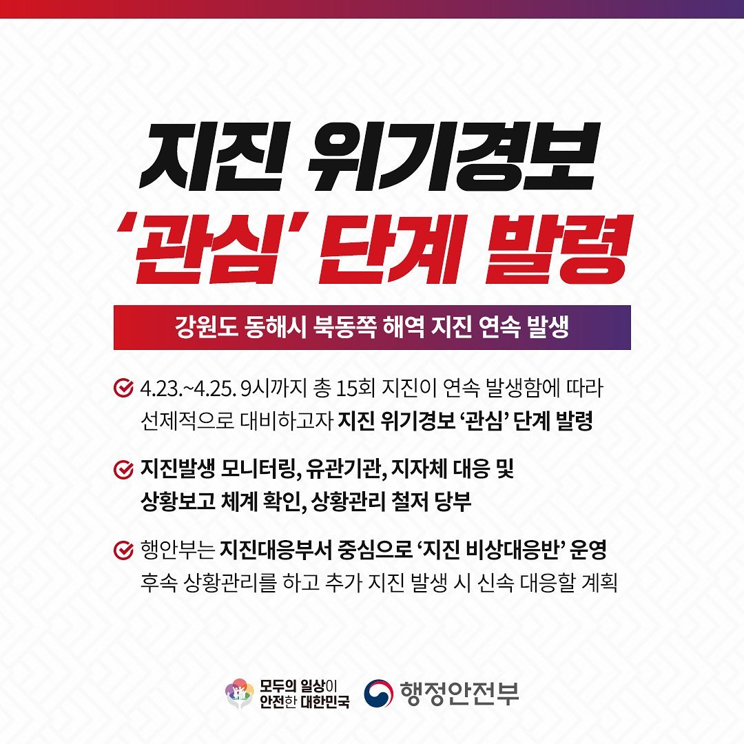 행정안전부는 4월 25일 새벽 5시 30분을 기점으로 지진 위기경보 '관심'단계를 발령했습니다. 지진 위기 경보 중 '관심'단계는 우리나라 국내 (내륙) 지역에서 규모 4.0보다 약한 지진 혹은 V등급 (모든 사람이 지진동을 느끼는 최대진도) 미만의 지진이 특정 지역에서 짧은 시간 동안 2회 이상 발생할 경우 내려집니다. 주의 단계는 관심 단계 보다 더 나아가 3회 이상이 발생할 경우 내려집니다.