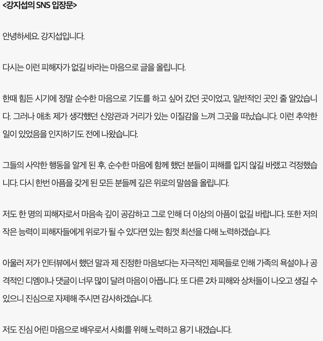 이후 강지섭은 인스타그램을 통해 쁘띠 예수 액자를 찢는 모습을 게시하며 4~5년 전부터 이미 다니지 않는다고 소속사를 통해 입장을 발표했습니다. 배우 강지섭은 힘든 시기에 순수한 마음으로 나간 일반적인 교회인줄 알았다고 말하고 추악한 일이 있음을 인지하기 전에 나왔다고 합니다. 그리고 다른 피해자들에게 도움이 되는게 있다면 최선을 다해 돕겠다고 입장문을 밝혔습니다.